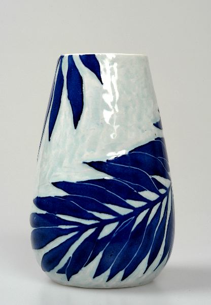 • Bladdekor i svag relief, sgraffito, mörkblå mot ljusare blå grund.