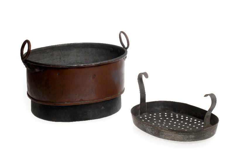 • Oval, med två ögleöron på var sida om kanten. Utan lock. Tillhörande durkslag.