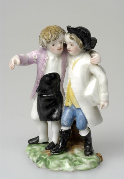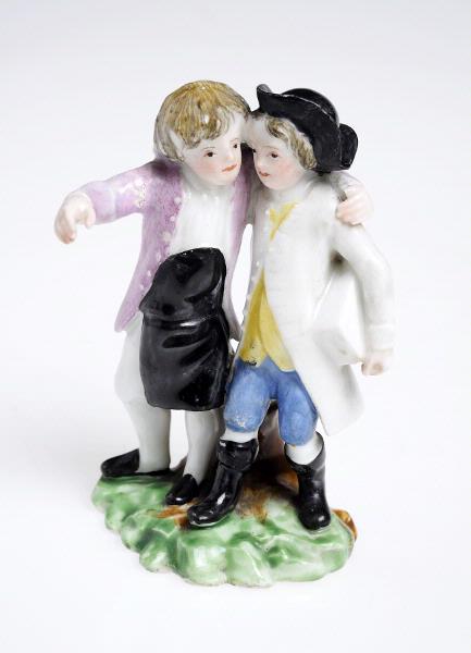Två pojkar, stående, har armarna om varandras axlar och för ett ivrigt samtal. Båda är klädda i rockar med runda knappar och knäbyxor. Den ene pojken har förkläde och skor, den andre väst, svart hatt och stövlar. Polykrom. Oregelbunden sockel med stubbe.