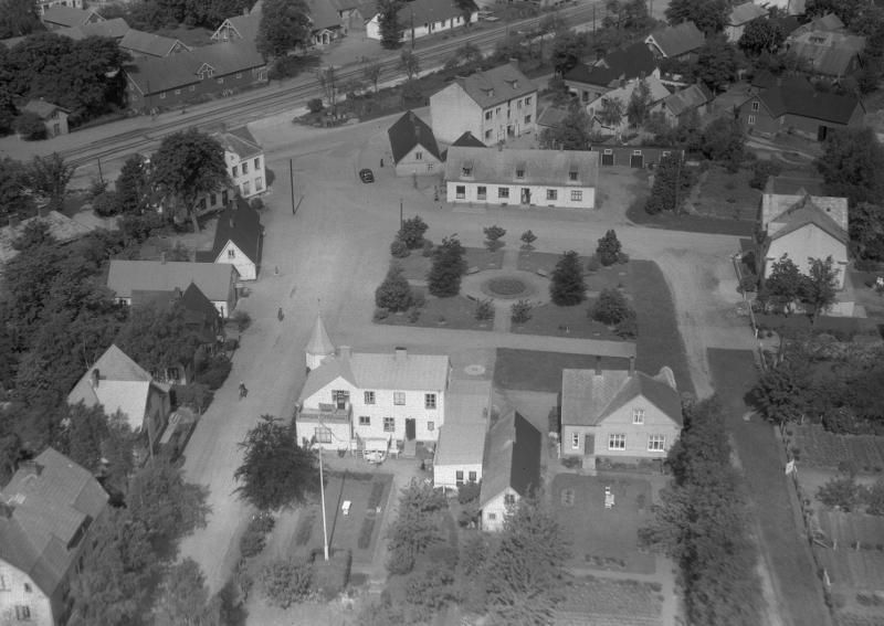 • Flygbild. Landskap, bebyggelse, järnväg. Lövestad, Sjöbo.