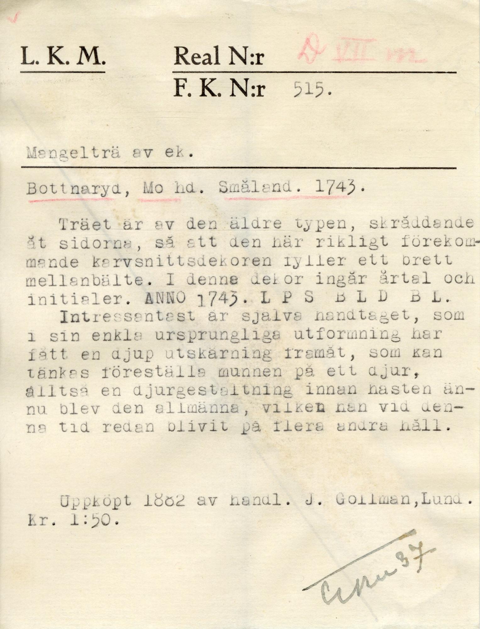 Rektangulärt, från handtaget utåt avsmalnande, med avfasade kanter. Infällt handtag, enkel typ, med en djup skåra i främre partiet, vilket möjligen kan härröra från en djurgestaltning. Brädet som är sprucket i mitten fasthålles av en smal tvärslå av järn, som löper genom handtaget. Karvsnittsornering, med bland annat rosor. Tandsnitt på de båda avfasade kanterna. Inskuret i brädets mitt: ANO 1743 L.P.SB.-L.D.BL. Omålat. Minsta bredd: 9,2 cm.