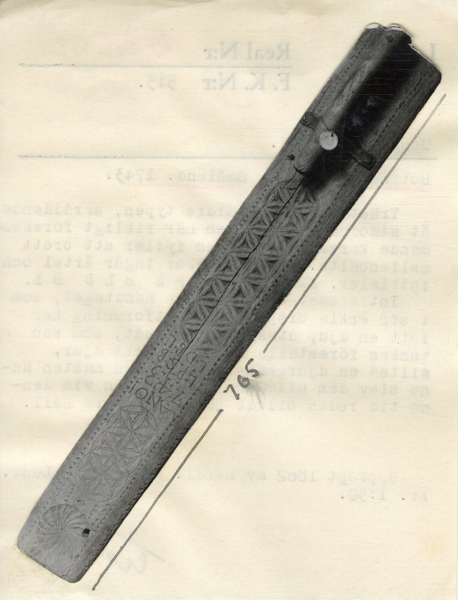 Rektangulärt, från handtaget utåt avsmalnande, med avfasade kanter. Infällt handtag, enkel typ, med en djup skåra i främre partiet, vilket möjligen kan härröra från en djurgestaltning. Brädet som är sprucket i mitten fasthålles av en smal tvärslå av järn, som löper genom handtaget. Karvsnittsornering, med bland annat rosor. Tandsnitt på de båda avfasade kanterna. Inskuret i brädets mitt: ANO 174...