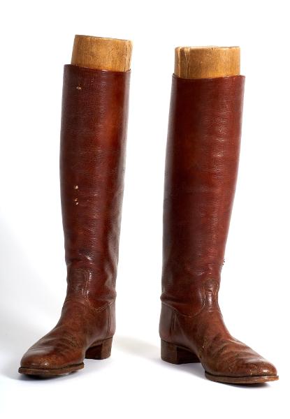 Bruna, med träblock. Består av två delar, framstycket och bakstycket som går ned i bakstycket. Med baknåt. Låg läderklack. Lädersula. Stropp bak. Fodrade med brunt skinn. Mått: klack H 3 cm, Br 5,5 cm. Defekter: skinnet avslitet på insidan av foten och några ställen mitt fram på skaftet.