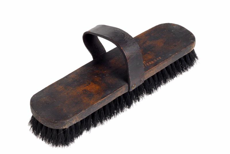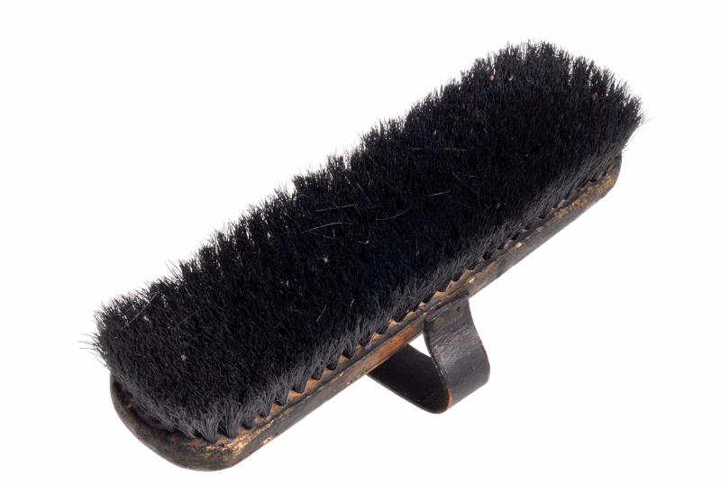 • Rektangulär med svart tagel. Läderrem är fäst tvärs över, till stöd för handen.