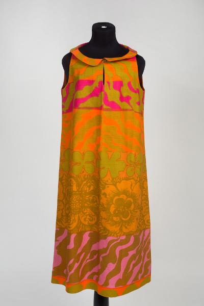 Ärmlös, knälång klänning i Fristedts mönster ”ANIARA” i cerise, rosa, grönt, och orange. Rundad krage med litet sprund som knäpps med 1 guldfärgad plastknapp. Rak modell, bystinsnitt från midjan. Ej fållad längs nederkanten. MMT-Boutique. Modell 395, i kvalitet 905. ”En liten krage, ett kort sprund, en rak silhuett, mer behöver inte Katja of Swedens klänning, som är expressionistiskt målad i underbara färger, rosa orange, grönt, och ockra” (MMT, Kulturens arkiv)