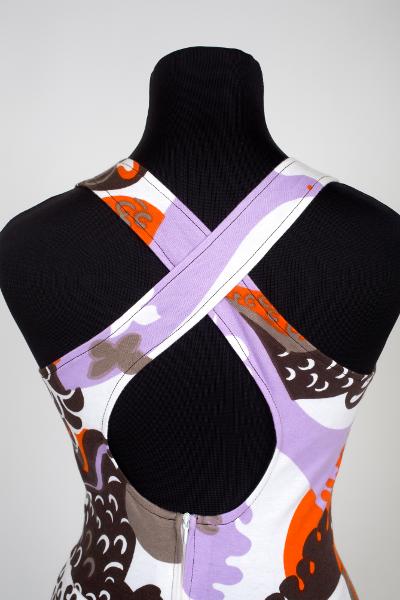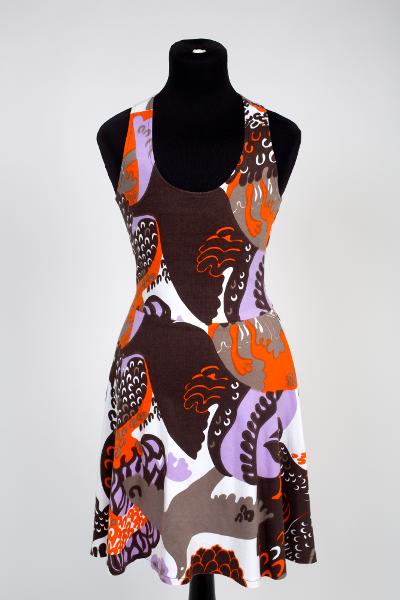 Kort klänning i mönstret PARADIS av Sven Fristedt i orange/brunt/lila/vitt. Rund urringad halsringning, 4 cm smala axelband som är korslagda i ryggen. Avskuren i midjan, vid kjol sydd i 1 del fram och 2 bak. Blixtlås mitt bak. Katjas Katjana. Modell 3155/1600.