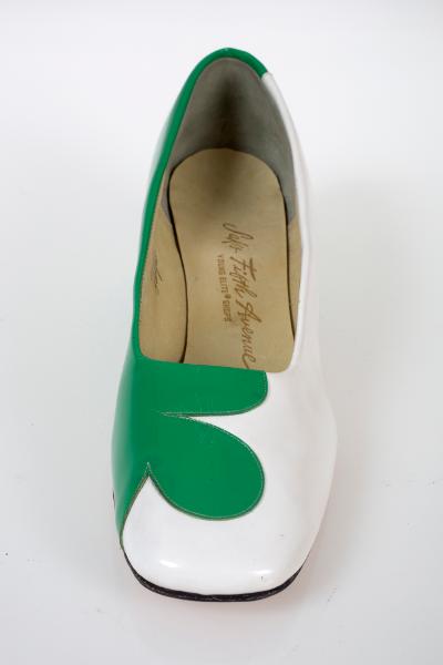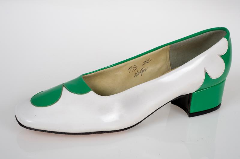 Vänstersko. Grön och vit öppen lackskinnsko med bred klack, 4 cm hög. Beige insida. Inskription i guld i innersulan: ”Saks Fifth Avenue, YOUNG ELITE SHOPS”. Skrivet med bläckpenna på insidan: ”7 1/2, 2W Katja”.
