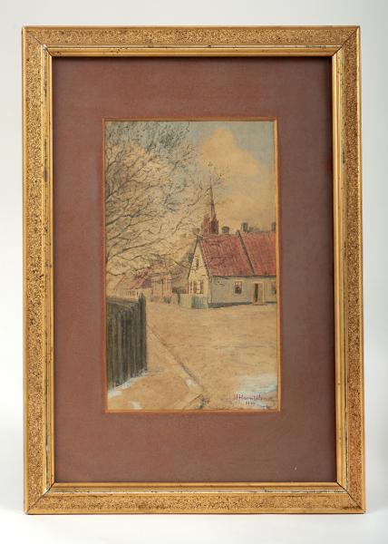 • Stadsmiljö med små gathus, i bakgrunden ett kyrktorn. Utsikt från Sandgatan 14 Lund, konstnärens föräldrarhem.