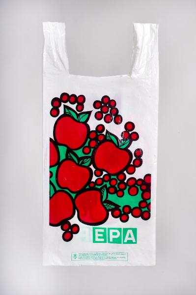 • Kasse, polyeten, vit med tryck i svart, rött och grönt av äpplen och bär. EPA.