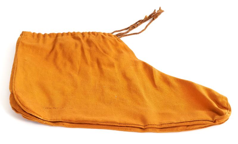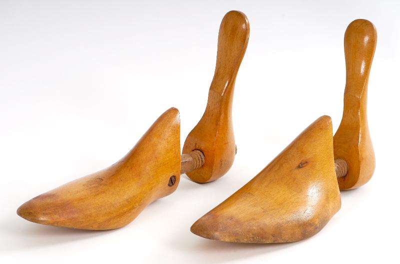 Lackat skinn, med svart resår i sidorna. Nåtlingen skuret i ett stycke. Svarta med blindsporrar av silver eller förnicklade, fästa med baknåt med stickningar. Skruvar i sidorna av klacken. Randsydda. Sulan i svartmålat läder. Klacklappar i läder, svarta med vitmetallspik/ stift. Fodrade i vitt bomullkypert. Mellanbrun innersula av skinn. Vita stroppar både framtill och bak. Mått: klack H 3 cm, Br 5,4 cm. Defekter: slitna, svärtade i sulorna och tyg; sprickor och torra i lacken, skinnet; svärtad silver; ingen stämpel i silvret; lagade i kanten foder resår; svarta stygn. Skoblock (träblock) ledade med träskruv, ställbar; denna fäst i främre partiet med en skruv i metall. Bakstycket högt tillsammans med draganordning. Lackade. Inristat (100 45) (45 99). Märkta med samma KM-nr. som skorna. Mått: L 28,5 cm, H 17,5 cm, Br 7,8 cm. Defekter: rostiga skruvar; svärtade, skavda i lacken; spruckna i ena träskruven bak. Ligger i bruna tygpåsar. Tygpåsar: Gulbrun bomullssatin med bomullssnoddar i övrekanten inne i dragsko. Sprund/ öppning fram där knytningen finns. Mått: L 34 cm, H 21,4 cm. Defekter: små bristningar i tyget; en större fläck samt några mindre.