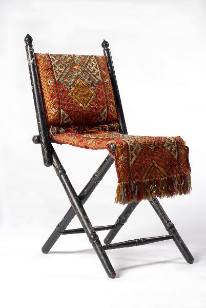 Svarvade svartlackerade pinnar, sits och rygg av korsstygnsbroderat tyg i blått, rött, gult, vitt och svart avslutad med fransar. Fram- och bakslå på benen.