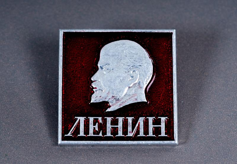 • Försilvrad pin i rött. Kvadratisk till formen. Lenin avbildad i silver mot bakgrund. Text på ryska: "Lenin" under porträttet i profil.