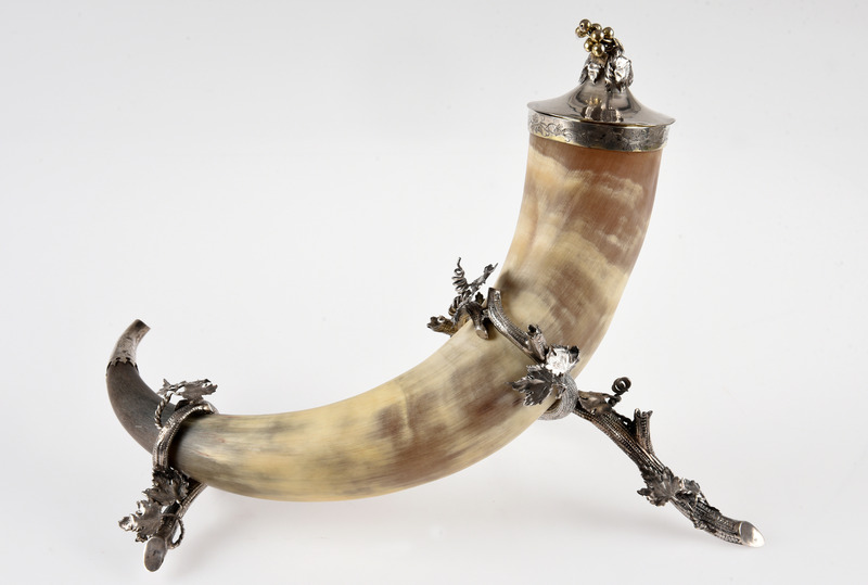 • Horn med lock och ben samt avslutning (spetsen) av silver. Stöd av vingrenar med löv, lock med vindruvklase och löv som knopp.