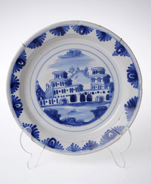 • Blå dekor med upprepat mönster runt kanten. I spegeln landskap och byggnad.