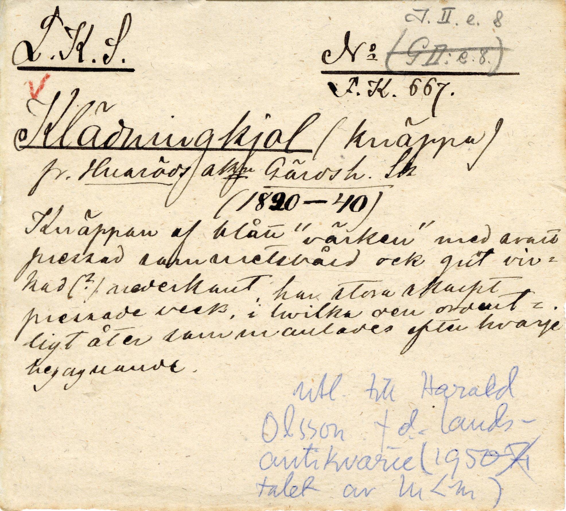 Klädningskjol (knäppa) fr. Huaröds skn Gärds h. Sk. (1820-40) Knäppan af blått "värken" med svart pressad sammetsbård ock gul virkad (?) nederkant har stora skarpt pressade veck i hvilka den ordentligt åter sammanlades efter hvarje begagnande. Utl. till Harald Olsson fd. lendsantikvarie (1950 talet av M L-m)