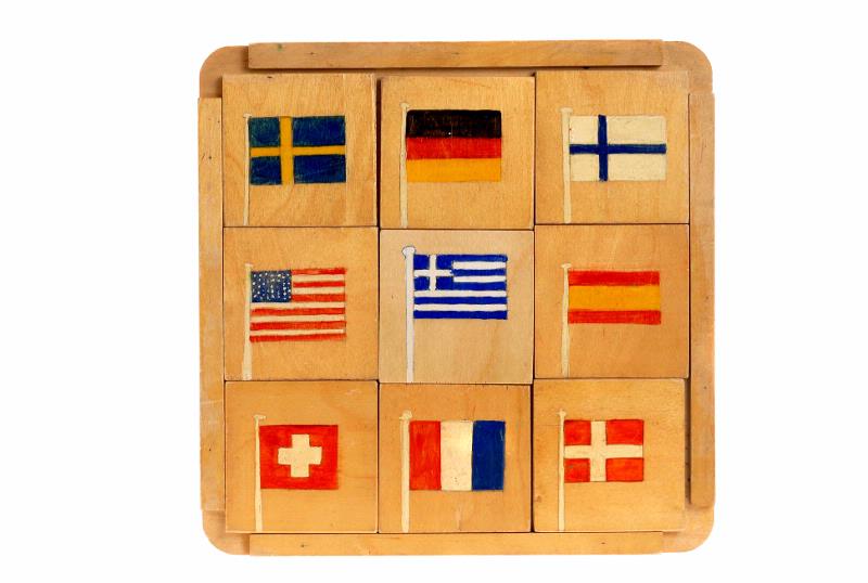 Av trä. Motiv målat på trä. Består av 9 bitar (7x7 cm). Nationsflaggor, från vänster till höger, Sverige, Tyskland, Finland, USA, Grekland, Spanien, Schweitz, Frankrike och Danmark. Pedagogiskt uppbyggt.