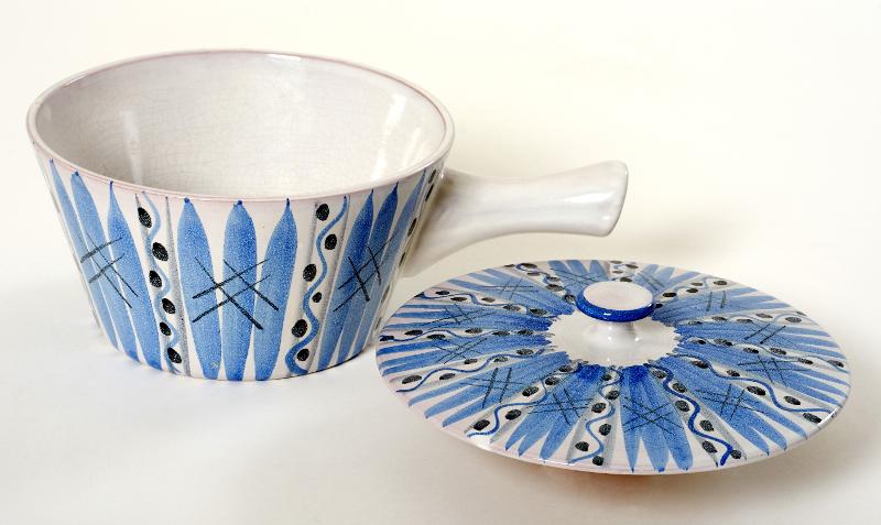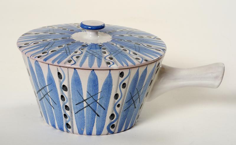Lergods av röd skärv. Tennglaserat severingskärl i form av gryta, rund med skaft och lock med platt rund knopp. Dekor i blått, grått och svart mot vit botten. Vertikalt målade dekorränder i blått och grått samt målade prickar och kryss.