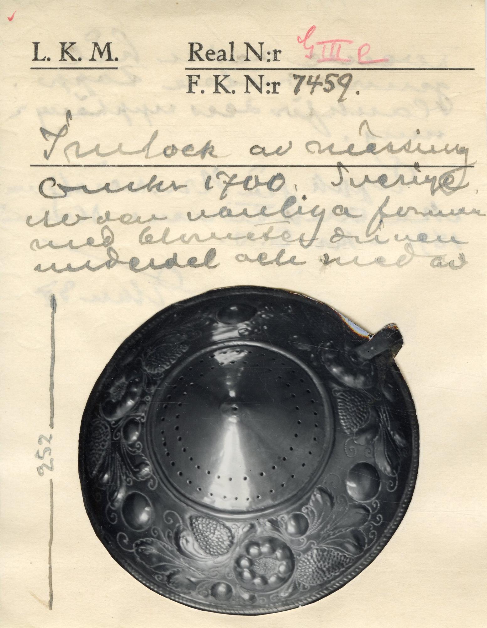 • Rund, konisk. Med hänkel och punsad, hamrad och pålödd(?) dekor i form av blommor, blad, kartuscher och kottar. Nederdelen med två rader med hål.