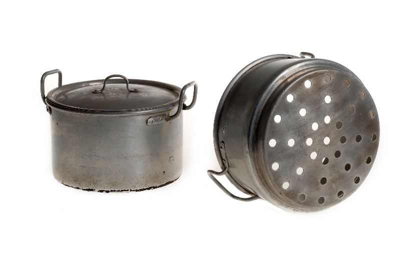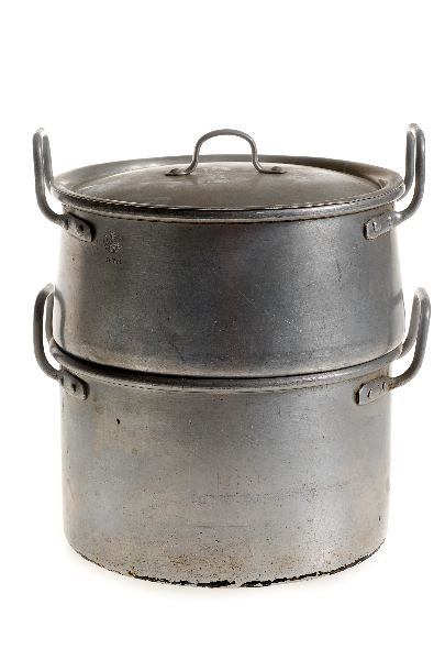 • För ångkokning, aluminium, övre delen med hål i botten, 2 handtag i vardera delen, lock med hänkel, tunnbottnad. Runt firmamärke m. "CFL" och "Carl Lunds Malmö" "2 l."
