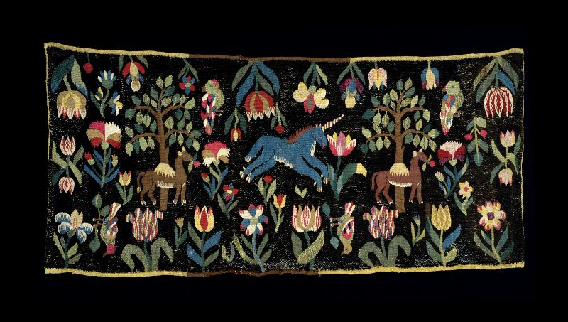 "Till gruppen [se KM 27078] kan man också räkna ytterligare en dyna. Den har som mittpunkt den löpande enhörningen, flankerad av dromedarer framför träd med många grenar och blad. Ytan är utffyld av strödda blommor och 3 fåglar. Mönsterteckningen är väl avvägd, så att detaljerna till höger och vänster motsvarar varandra. Blommorna är emellertid mera stiliserade än på de andra två dynorna [bl a då KM 27078], men sammanhanget mellan dessa och dromedardynan är otvetydigt. Tulpanen med de korslagda bladen förekommer och i övre högra hörnet samma nedåtvända tulpaner. Väverskan har dock ersatt andra blommor med nejlikor, narcisser och tulpaner. I övre kanten är samtliga vända nedåt. Dynan skall ha vävts på 1830-talet, sannolikt av den nuvarande [1962] ägarinnans farmor Margareta Svensdotter (f. 1821). Familjen har i många generationer varit bosatt i Simlinge vid Trelleborg och vävnaden bör ha tillkommit där. [Detta är missuppfattning fr Fischers sida, familjen var bosatt på Stenkulla gård, Slimminge socken, Torna hd. // Karin H. 2016] Ernst Fischer, Flamskvävnader i Skåne, s. 258