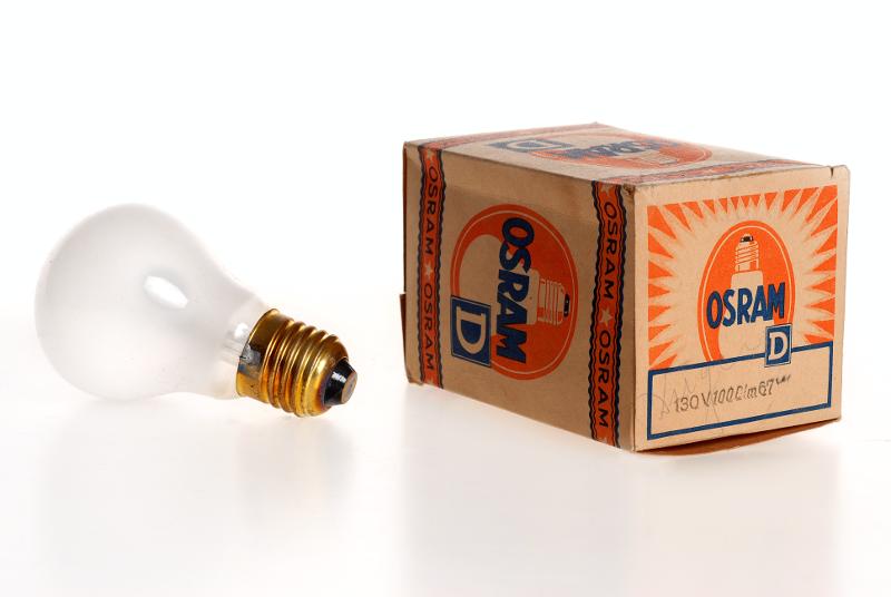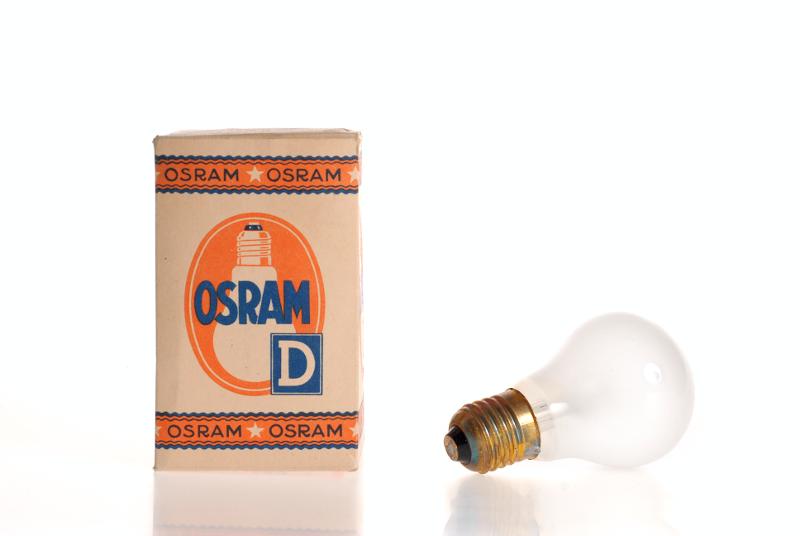 • "Osram D 120 volt 4 C O 40 Dekalumen 34 watt" i kartong med beteckning "130 V 100 Dlm 67 W".