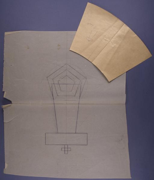 • Femkantigt oblatskrin på hög kantig fot, lock med tredimensionellt kors. Mallar finns till. Se KM 70.852 motsvarande sexkantig.