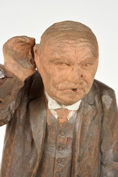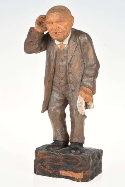 Träskulptur av Georg Hallgren. Helfigur i miniatyr avbildande källarmästare Göthe. Skuren i ett stycke. Stående på kvadratisk sockel, med högra handen vid örat och en vit serviett i vänster hand, iklädd grå kostym med väst samt vit skjorta och röd slips. Signerad på sockeln "G.H. 1916". samt undertill "Georg Hallgren 1916".