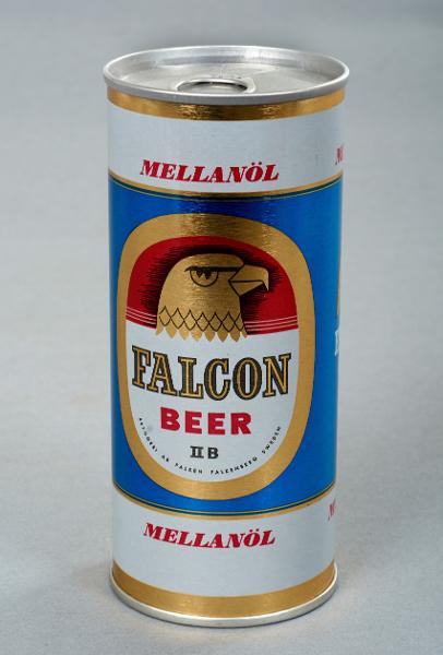 Förpackning för öl, ölburk; aluminium; cylindrisk burk med avfasade kanter 45 cl; motiv av örn i guld, med röd bakgrund i guldram och på blå bakgrund; Falcon Beer IIB, mellanöl; h 15,5 cm; diam 6,5 cm; formgivare Rune Ohlin; tillverkningsperiod 1970-1990 av PLM, Malmö. Givaren arbetade som tecknare och grafisk formgivare hos Åkerlund & Rausing ca 1955-1960 och på PLM från 1960 fram till sin pensi...