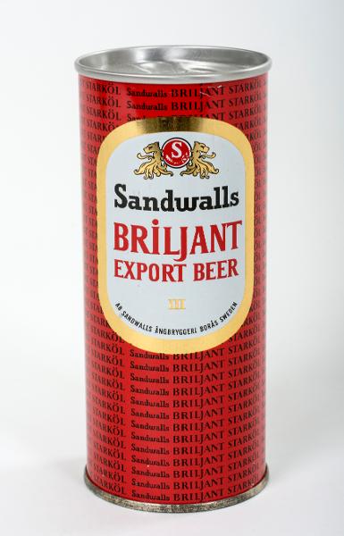 Ölburk; aluminium; cylindrisk burk med avfasade kanter 45 cl; röd botten med svart text, i guldram på vit botten: Sandwalls Briljant Export Beer II AB Sandwalls ångbryggeri Borås Sweden ; h 15,5 cm; diam 6,5 cm; formgivare Rune Ohlin; tillverkningsperiod 1970-1990 av PLM, Malmö. Givaren arbetade som tecknare och grafisk formgivare hos Åkerlund & Rausing ca 1955-1960 och på PLM från 1960 fram till sin pensionering 1999. Han har under åren samlat exempel från PLM:s verksamhet i form av original, provtryck, förlagor, oanvända förpackningar mm. Han har även samlat exempel på kollegors formgivning. Han fick bland annat utbildning på ÅR:s atelje där han började på 1950-talet. Han har även arbetat och ställt ut som konstnär, se uppgiftsboken.