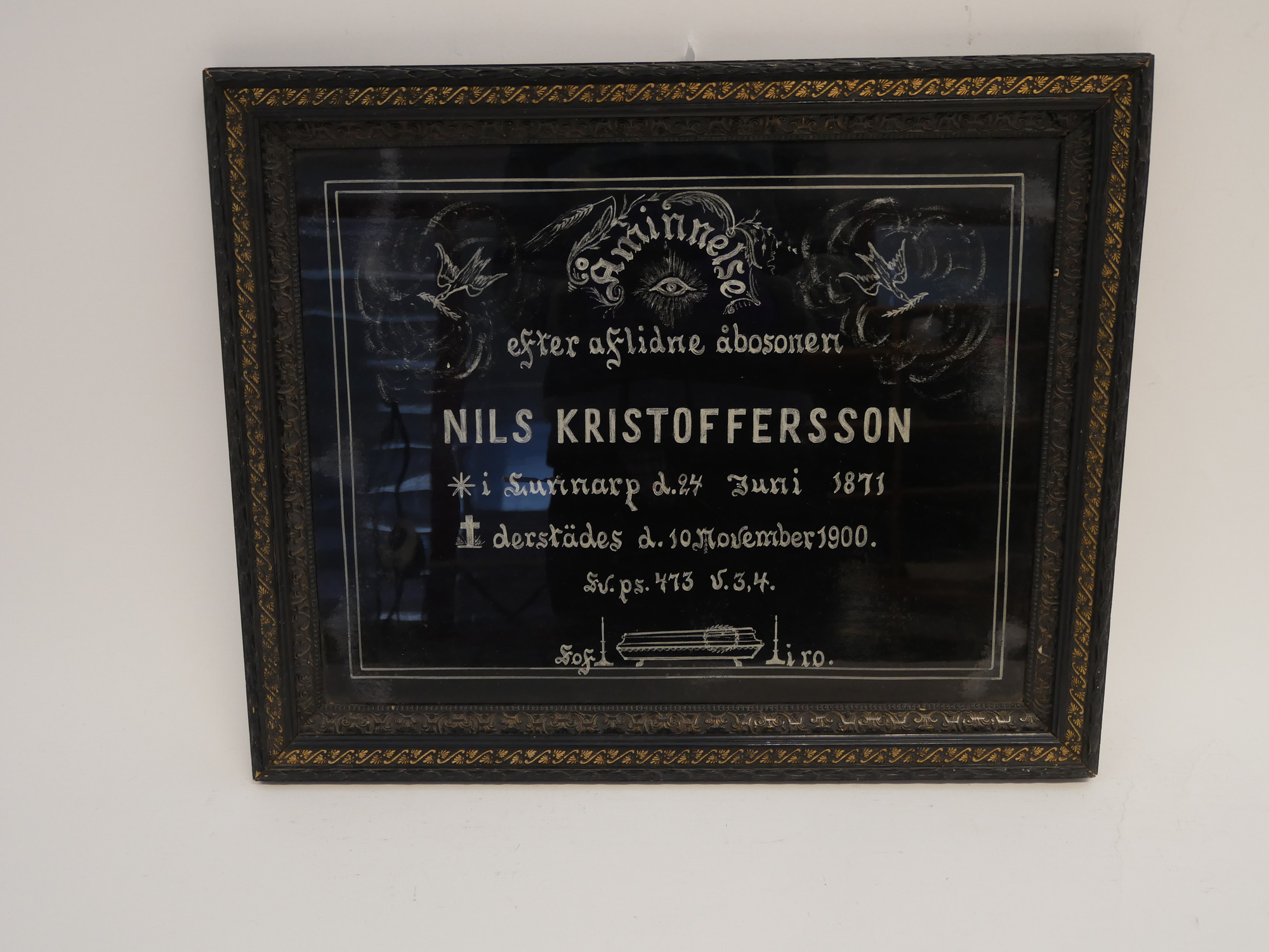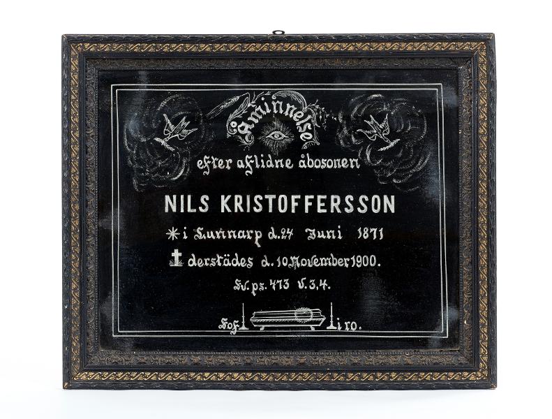 Målning med silverfäg och svart på glas. Text: Åminnelse efter aflidne åsbosonen NILS KRISTOFFERSSON * Lunnarp d. 24 juni (avritat kors) därstädes d. 10 Nov. 1900. Sv. Ps. 473 v. 3, 4. Sof i ro. Avbildad likkista samt fåglar med kvist i näbben. Svart ram med relief och guldornering. Dagermått: 43,5x33,5 cm.