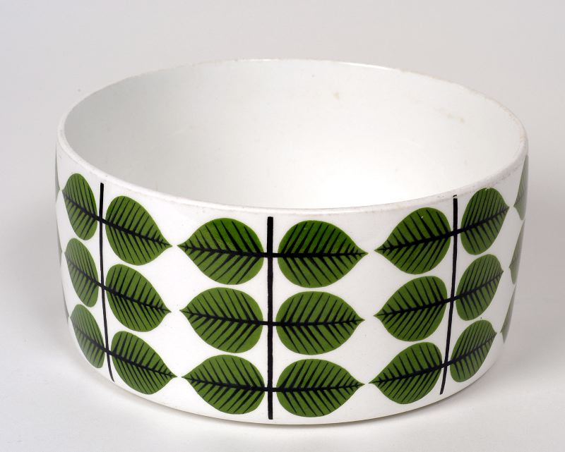 • Rund, raka sidor; tryckt dekor av gröna blad på svarta stammar: Berså.