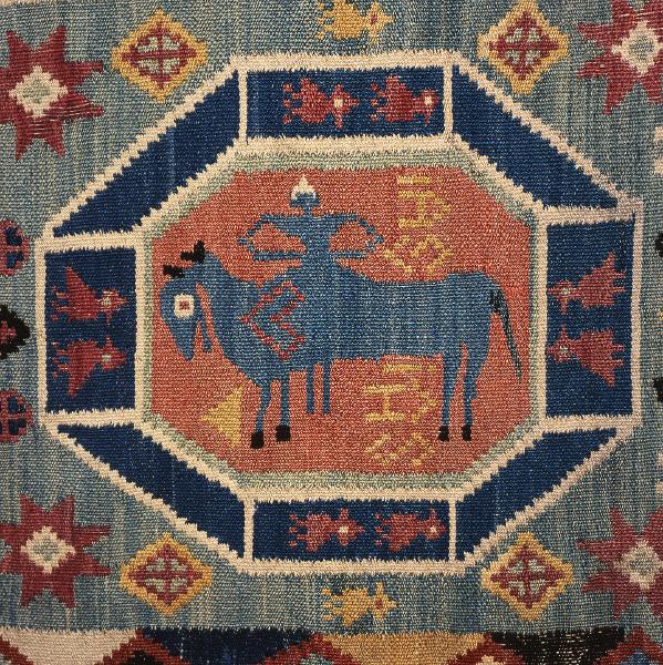 Enligt muntlig tradition en åkdyna för kyrkfärd. Liknande åkdyna, från Håslöv i Skytts härad, finns upptagen i Malmöhus läns hemslöjds inventering från 1916. Motivet på den åkdynan innehåller även en vit duva (glädjens budbärare) och en tupp (symbol för uppståndelsen). /uppgiften lämnad av Åke Asmundsson.