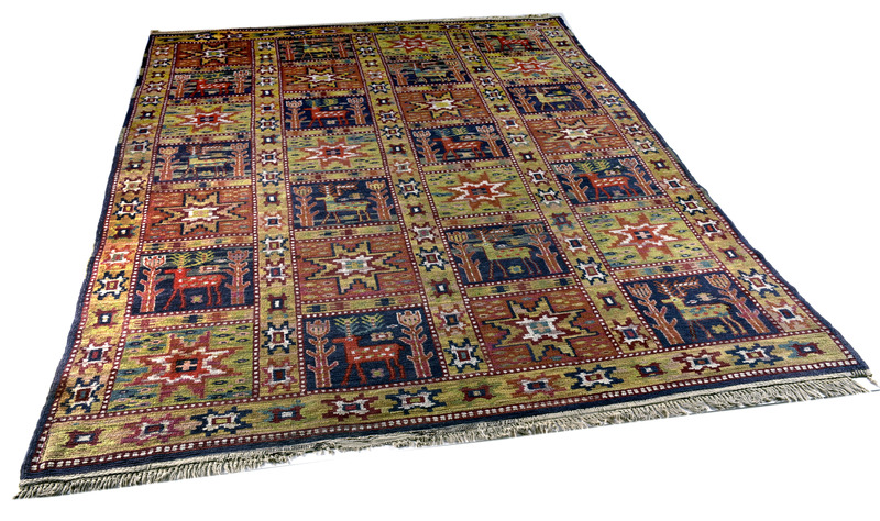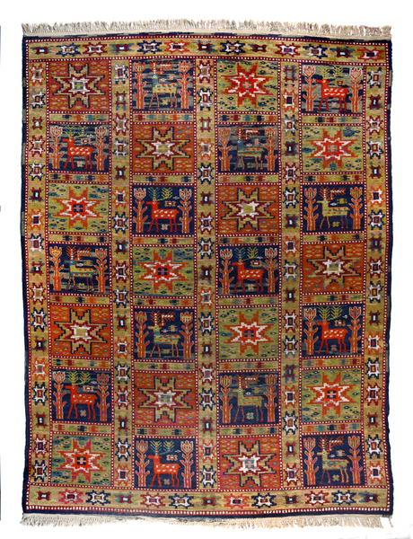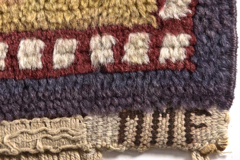 Varp av lingarn 4 trådar/cm, inslag av dubbelt ullgarn 7 trådar/cm i brunt och beige, nock av polykromt ullgarn; motiv föreställande åttauddiga stjärna, hjort mellan tulpaner, fyra motiv i bredd, sju på längden, ramen med mindre åttauddiga stjärnor; knuten frans påsydd.