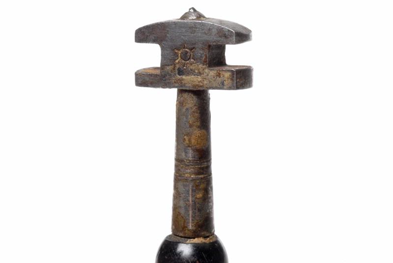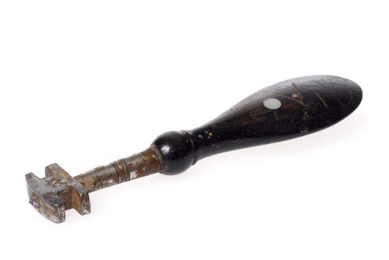 Verktyg i stål med två fyrkantiga jack, ett par varje sida för olika glastjocklekar; längst ut på stålet sitter en diamantspets; svartmålat trähandtag, svarvat inne vid fästet, längre ut bredare med en flat, uttunnad ände; mittpå handtaget en liten rund pärlemorinläggning; på handtaget inristat ViD.