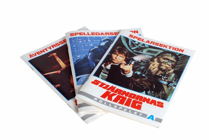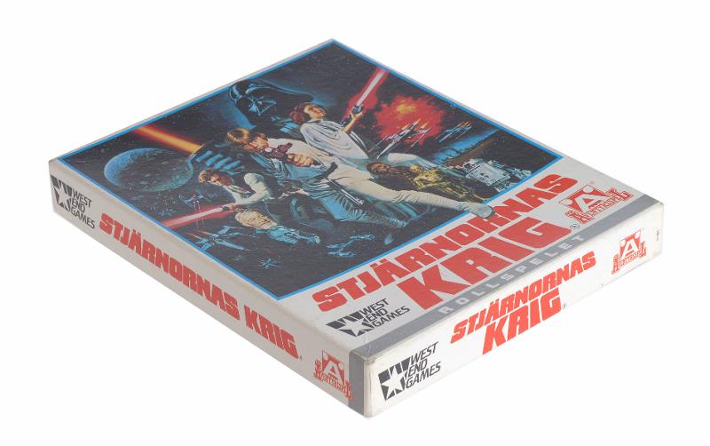 Stjärnornas krig rollspelet. Kartong innehållandes 3 texthäften: A spelfunktion, B spelledarsektion, C äventyrssektion samt två lösa blad med informationstabeller angående vapens användning samt poänglistor. Spelet spelas med tärning och tennfigurer.