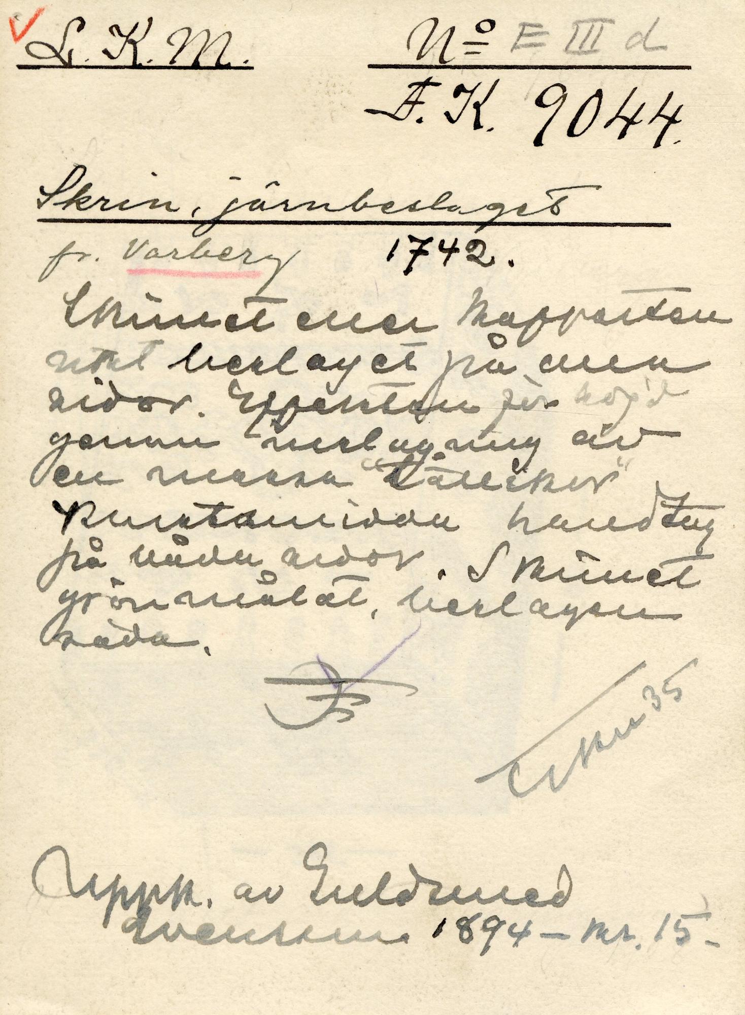 Skrin, järnbeslaget fr. Varberg 1742. Skrinet eller kofferten rikt beslaget på alla sidor. Effekten förhöjd genom inslagning av en massa "tällikor". Konstsmidda handtag på båda sidor. Skrinet grönmålat, beslagen röda. L 50 cm, H 39,5 cm, B 33 cm. Uppk. av Guldsmed Svensson 1894 - kr. 15- [avritad på katalogkort]
