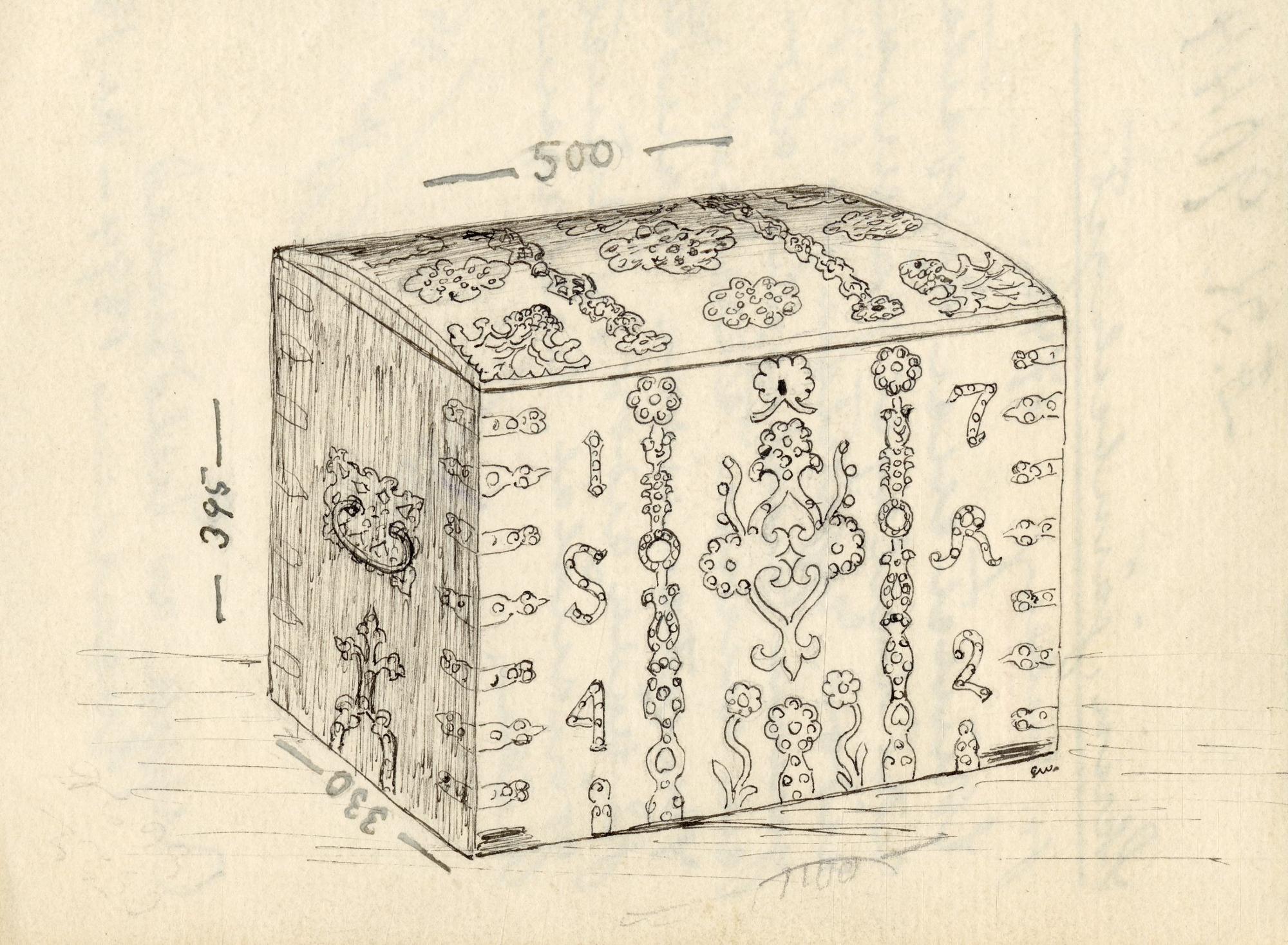 Av ek, rektangulärt, något välvt lock av fur. Grön bakgrundsfärg, ovanpå denna rikligt med nitade, rödmålade järnbeslag som föreställer tulpaner, rosetter, voluter med mera samt SR 1742. Den röda och gröna färgen ursprunglig. Nyckelhål upptill på framsidan, låset saknas.