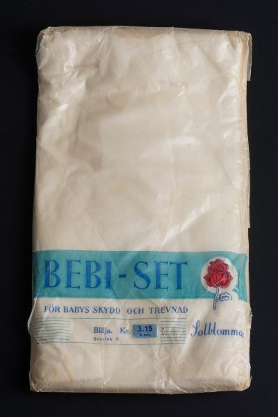 • Gulnad genomskinligt papperspåse (typ smörpapper) med tryck i blått på turkost band: BEBI-SET. Undertill: FÖR BABYS SKYDD OCH TREVNAD. Tryckt dekor med röd ros med text: Solblomman. I blått: Blöja. Storlek 2 Kr. 3.15 Ej oms. Iförpackningen 1 st naturvit tygblöja (se KM 95565). I pappersförpackningens botten ett underlägg i kartong med reklam för olika babyprodukter.