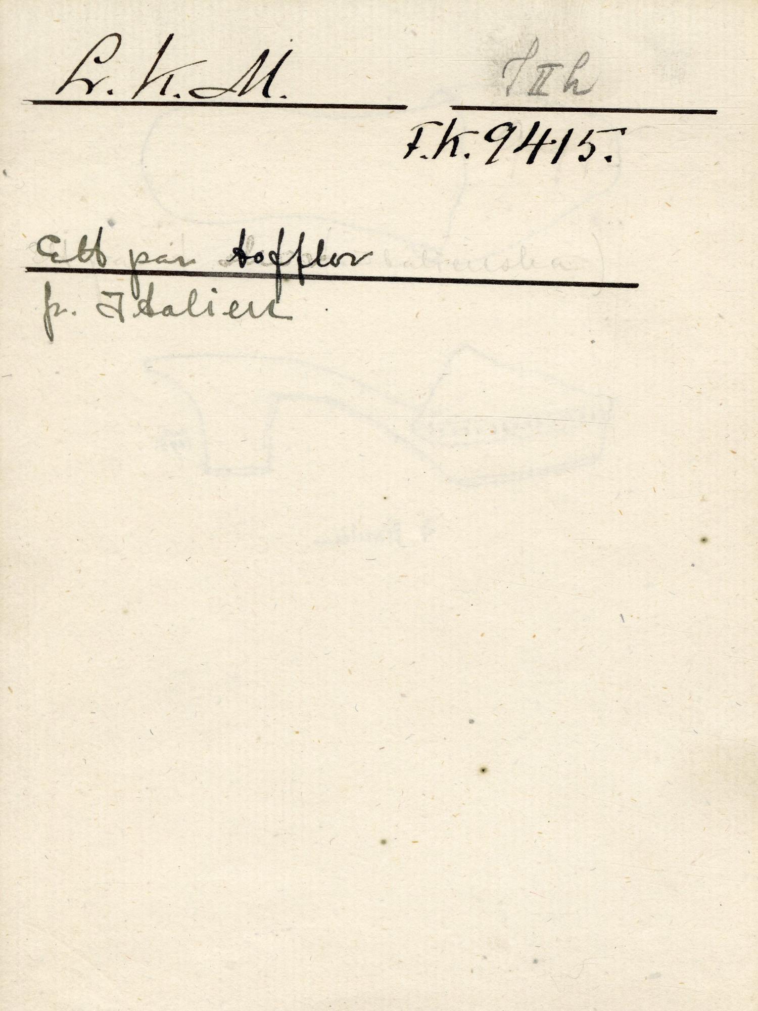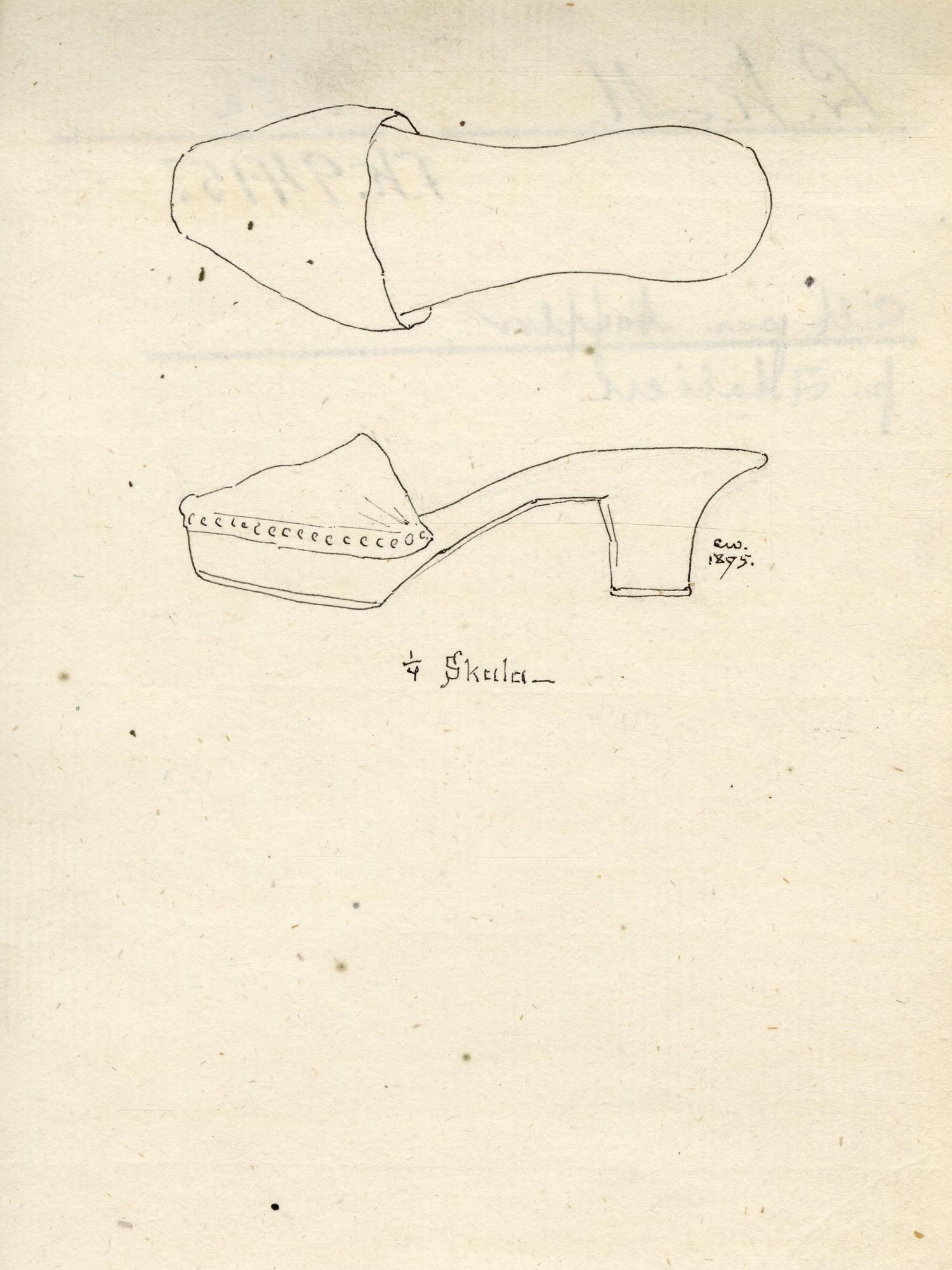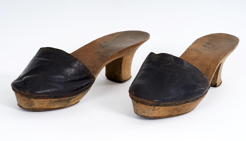 Sula och klack av ofärgat trä i ett stycke. Överdel av svart skinn, nitad fast med spik. Sula och klack klädda med läder, nitat med små spik. Mått: klack H 4 cm, Br 3,3 cm, sulans tjocklek 1,5-2 cm. Defekter: ovanlädret slitet och veckat; slitna sulor; träet har mörknat.