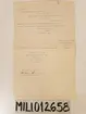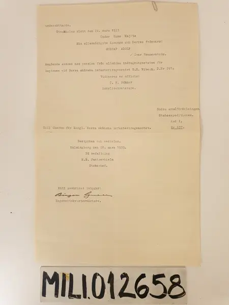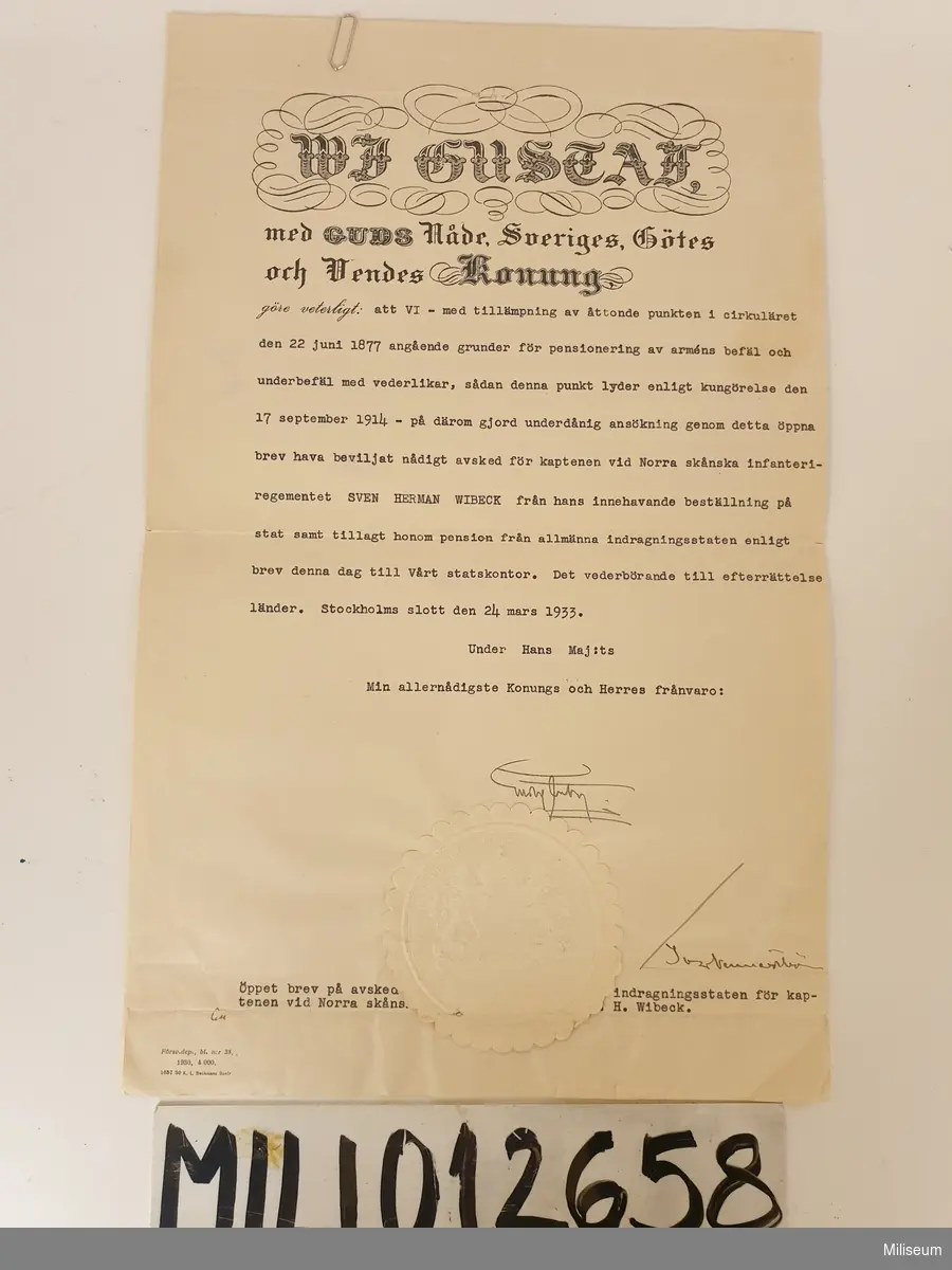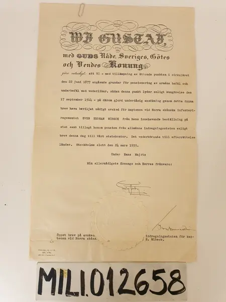 Avskedsbrev samt pensionsbevis från 1933, undertecknat av H K H kronprins Gustaf Adolf. Ingår i dokumentsamling rörande Sven Herman Wibeck (f.1890, kr.tj.1909, off.fullmakt 1911, kn 1926), bl a regementsadjutant vid Jönköpings regemente, I 12. Skänkta av sonen Gösta Wibeck.