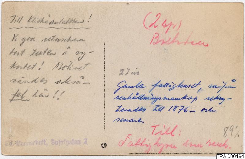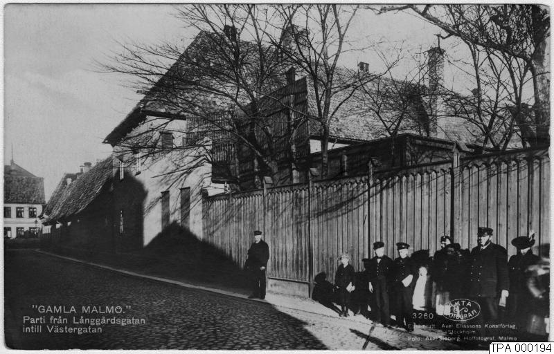 Gatubild. Långgårdsgatan norrut mot Västergatan. Bryggarlagets hus i två våningar tjänade vid den här tiden som fattighus och tillsammans med flera andra fastigheter i kvarteret (Gråbröder) bildades en anläggning med arbets- och försörjningsinrättning och barnhus (utåt Västergatan).