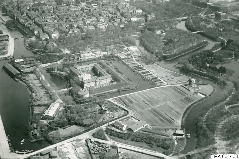 • Flygbild över Malmöhus slott som fängelse. Notera cellfängelset utanför vallgraven, Slottsparken, Kungsparken. Stämpel: Aero Materiel AB.