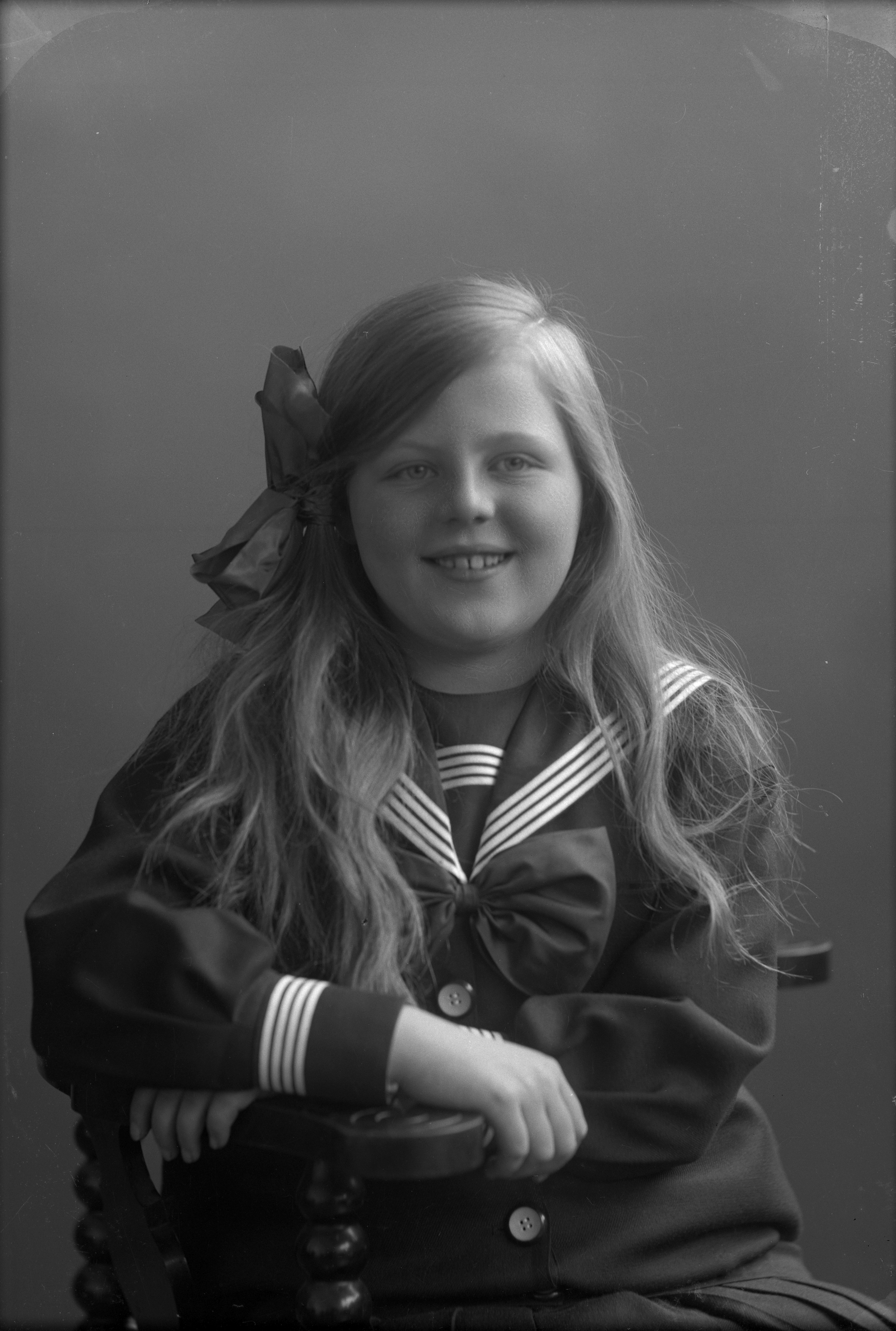 • Porträtt i halvfigur av fröken von Essen, iklädd sjömanskostym, med stor rosett i håret.