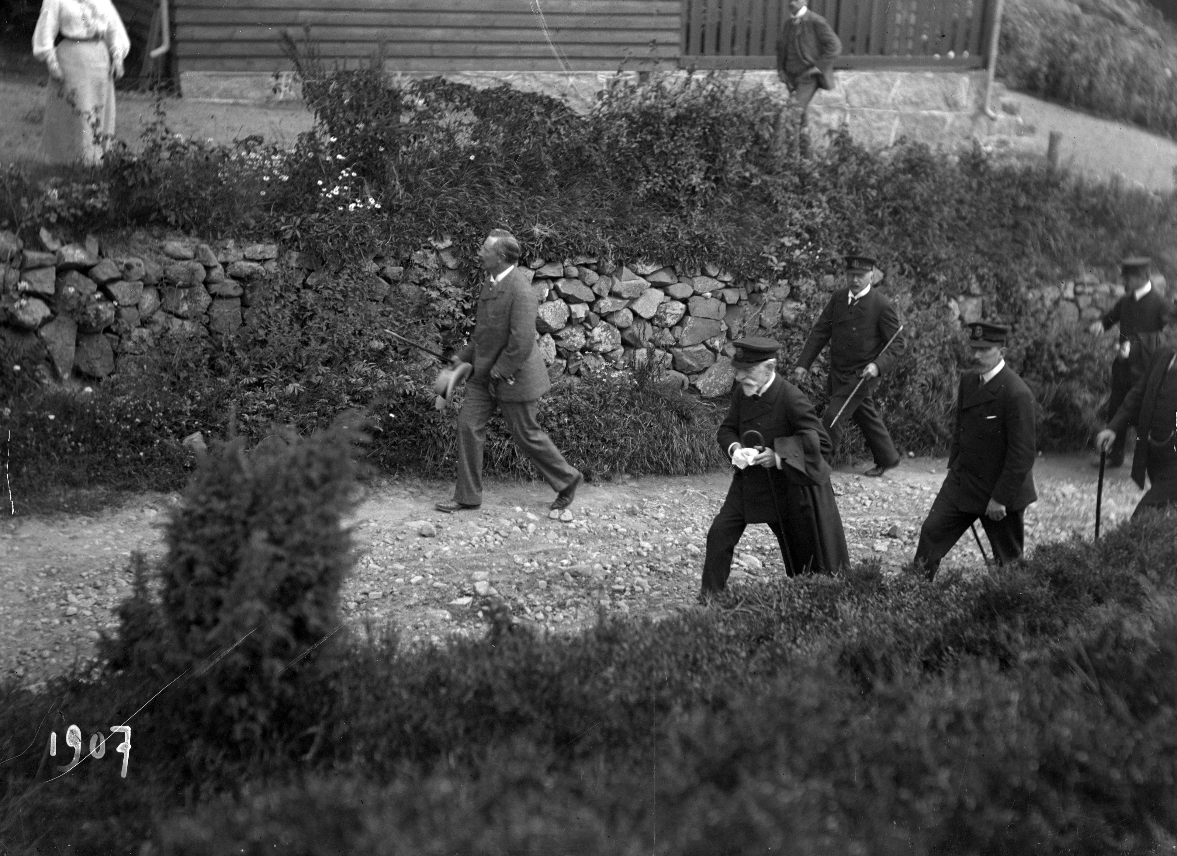 Grupp av män på landsväg, vid villa. 1907.Medium på orginalet: Glasplåt. 9x12 cm.