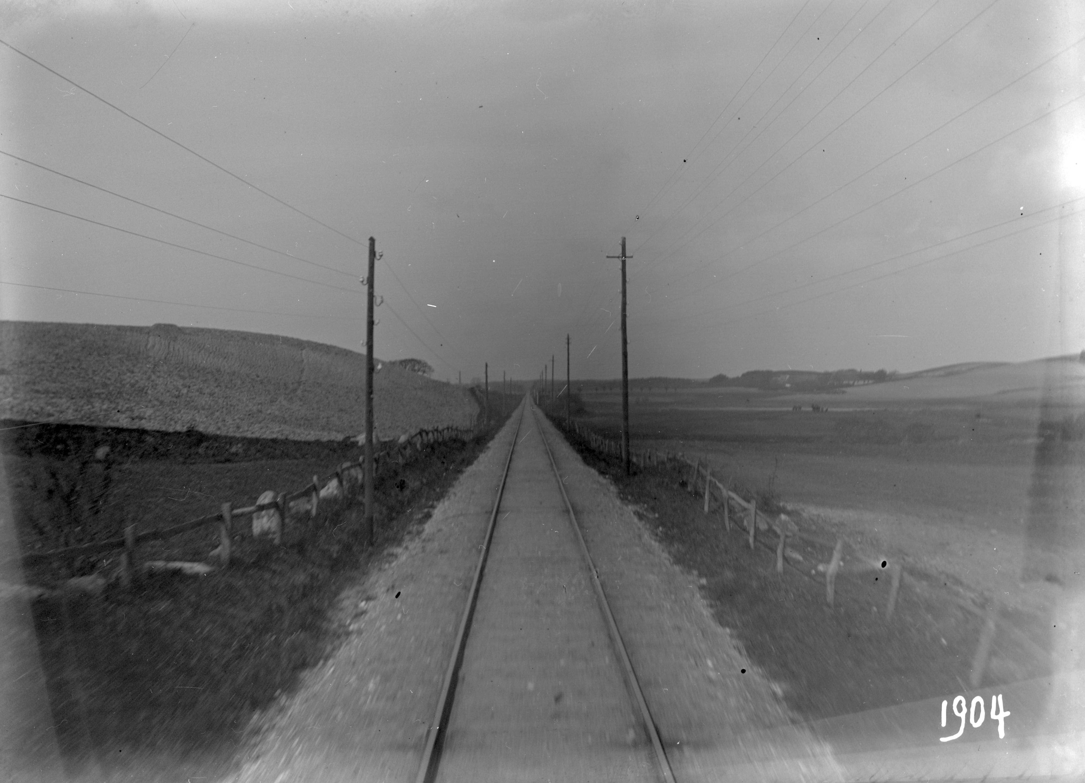 Bild från tåg-järnvägsräls, öppet landskap. Malmö-Ystad. 1904.Medium på orginalet: Glasplåt. 9x12 cm.