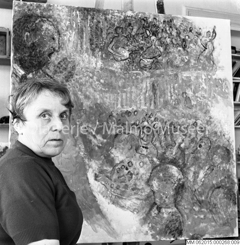 • Svea Bjurling (1910-2002) vid tavla, 1967. Bilden är tagen i projektet "I Närbild" som gjordes på uppdrag av Skånes Konstförening.