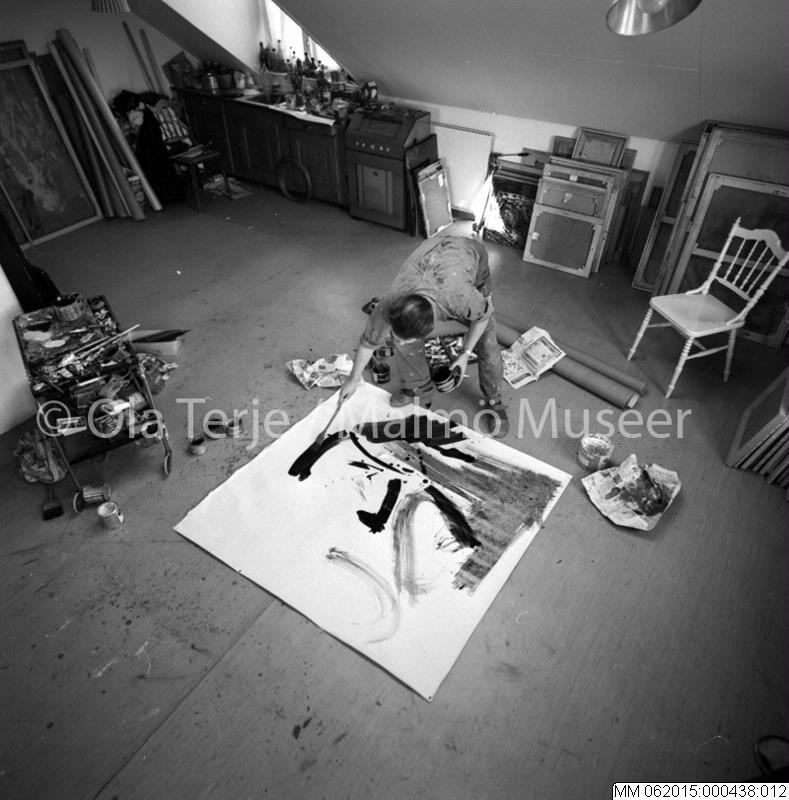 Carl Otto Hultén (född 1916) arbetande i ateljé. 670422.Bilden är tagen i projektet "I Närbild" som gjordes på uppdrag av Skånes Konstförening.
