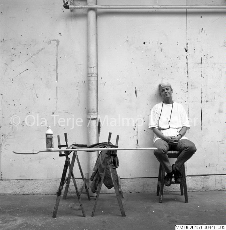 Acke Hydén (född 1943) sittande på pall i ateljé. 900726.Bilden är tagen i projektet "I Närbild" som gjordes på uppdrag av Skånes Konstförening.