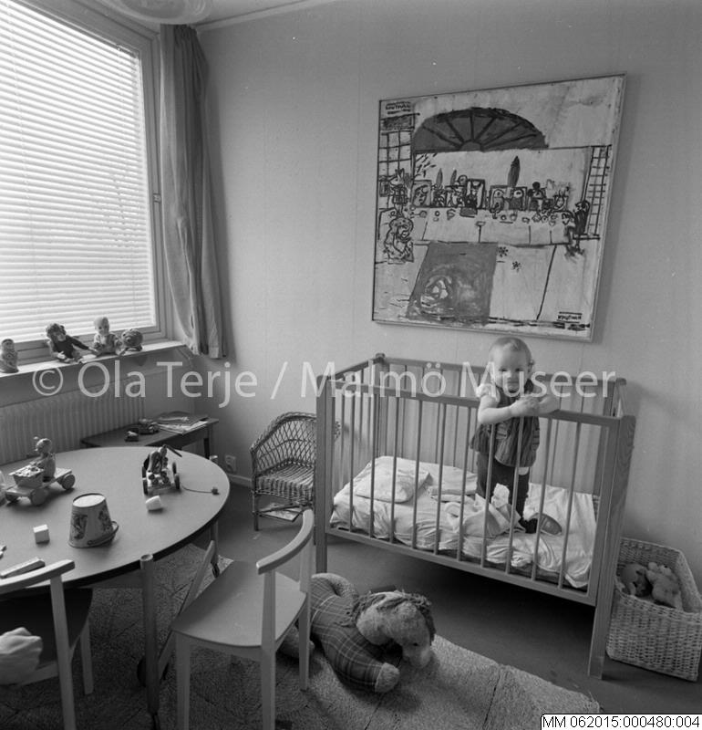 • Rumsinteriör, barn i spjälsäng. Bruno Knutman,1968? Bilden är tagen i projektet "I Närbild" som gjordes på uppdrag av Skånes Konstförening.