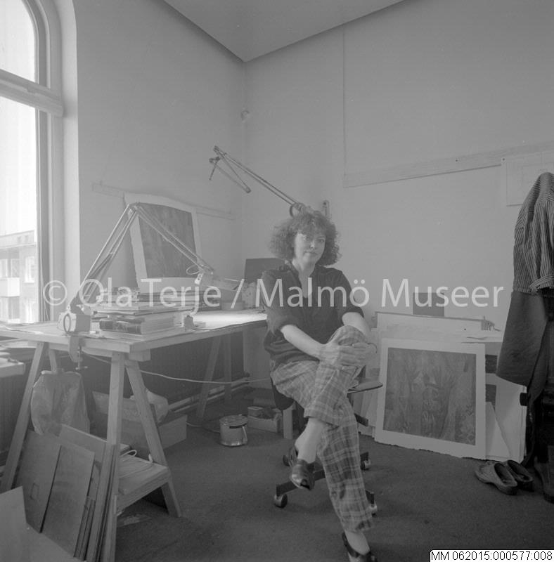 • Konstnären Helmtrud Nyström (1939-) i ateljén. 860506.